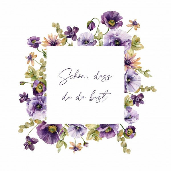 Mit ihrem charmanten Motiv in Weiß, Violett und Grün bringen die Lunch-Servietten "Schön, dass du…" eine einladende und persönliche Note auf deinen Tisch. Perfekt, um deinen Gästen zu zeigen, wie sehr du dich über ihre Anwesenheit freust.