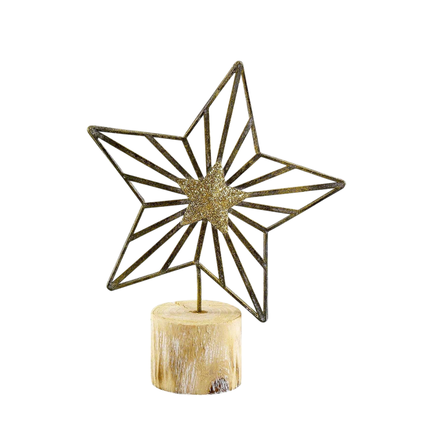 Höhe: 18 cm • Natur-Grau-Gold Farbgebung • "Gold-Touch" Design • Hochwertige Metall-Holz-Kombination • Sternform • Natürliche Materialien • Luxuriöse Weihnachtsdekoration • Elegante Oberflächenveredelung