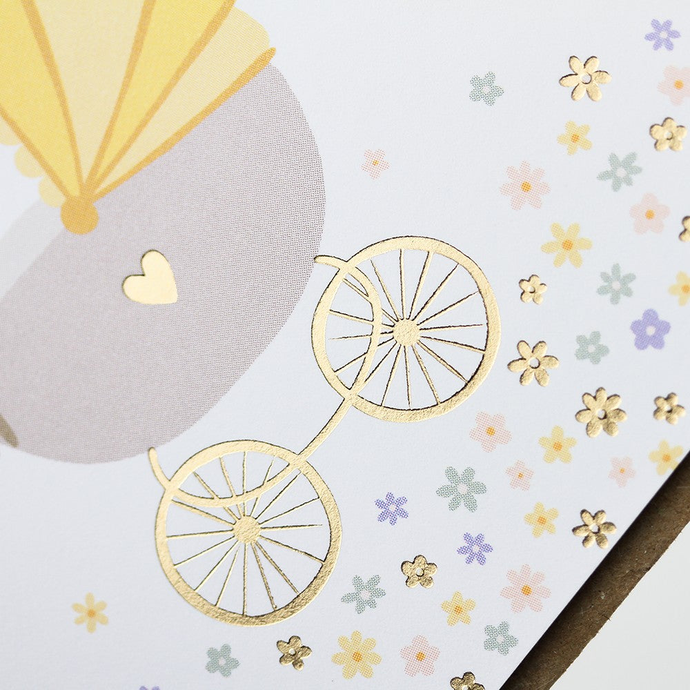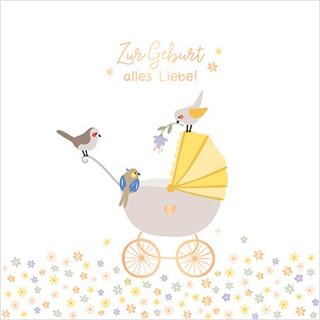 Quadratische Doppelkarte mit dem Text „Zur Geburt alles Liebe!“. Format: 115 x 115 mm. Ideal als stilvolle Karte für herzliche Glückwünsche zur Geburt oder als Beilage zu einem Geschenk für das Neugeborene.