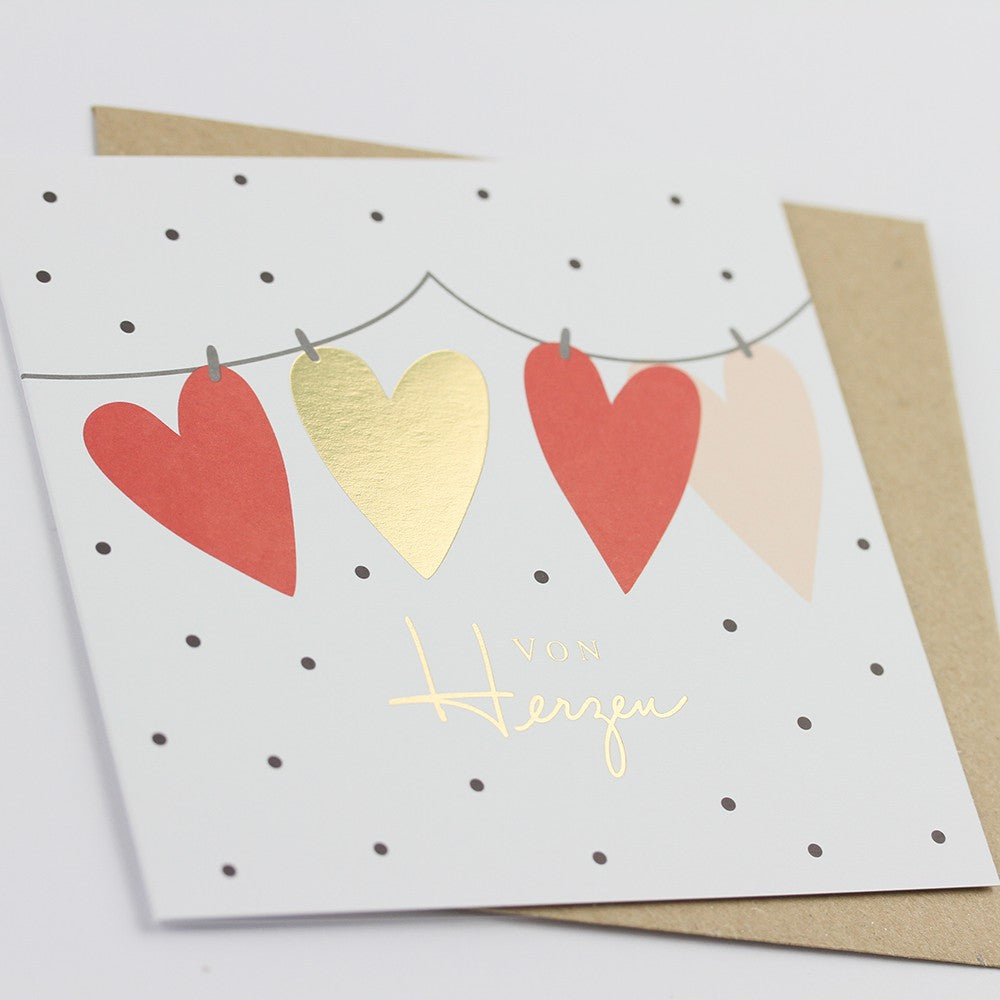 Quadratische Doppelkarte mit dem Text „Von Herzen“. Format: 115 x 115 mm. Ideal als stilvolle Karte für liebe Grüße, Glückwünsche oder als Ergänzung zu Geschenken zu verschiedensten Anlässen.