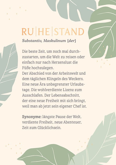 Die Classic Line Doppelkarte im Hochformat ist die perfekte Wahl, um zum Ruhestand zu gratulieren und Wertschätzung für einen neuen Lebensabschnitt auszudrücken. Mit dem augenzwinkernden Text „RU|HE|STAND Substantiv, Maskulinum [der] Die beste Zeit, um nochmal durchzustarten, um die Welt zu reisen oder einfach nur nach Herzenslust die Füße hochzulegen. Der Abschied von der Arbeitswelt und dem täglichen Klingeln des Weckers. Eine neue Ära unbegrenzter Urlaubstage. Die wohlverdiente Lizenz zum Ausschlafen. Der Lebensabschnitt, der eine neue Freiheit mit sich bringt, weil man ab jetzt sein eigener Chef ist. Synonyme: längste Pause der Welt, verdiente Freiheit, neue Abenteuer, Zeit zum Glücklichsein.“ vermittelt die Karte Humor, Lebensfreude und Zuversicht. Das großzügige Format von 120 x 170 mm bietet viel Platz für persönliche Wünsche und macht diese Karte zum inspirierenden Begleiter für den Start in den Ruhestand.