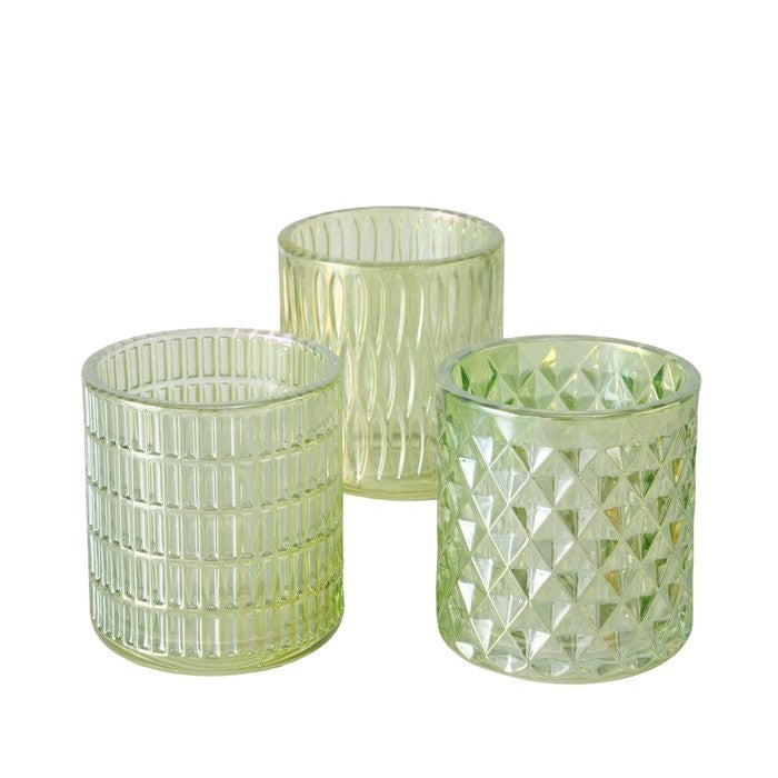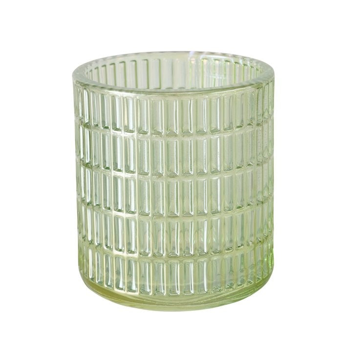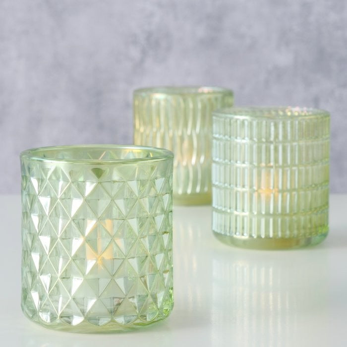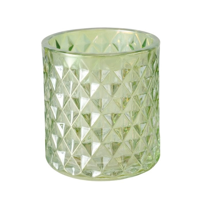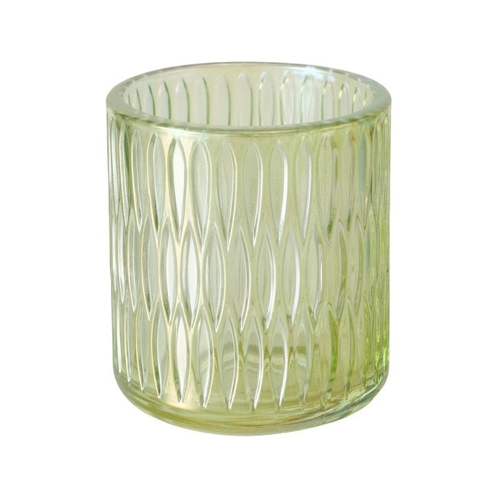 Höhe: 9 cm • Durchmesser: 8 cm • Lackiertes Glas mit Relief • Irisierender Glanz-Effekt • Grüne Farbgebung • Relief-Oberflächenstruktur • Einfarbiges Design • Runde Form • Freistehend für Tisch
